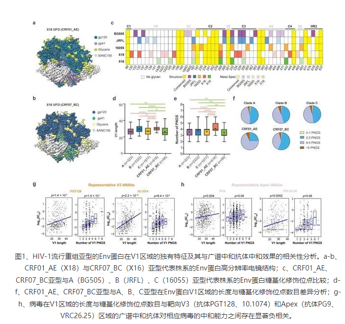 研究團(tuán)隊首先利用單分子冷凍電鏡技術(shù)與生物大分子質(zhì)譜全面揭示了CRF01_AE和CRF07_BC代表型株系的Env蛋白結(jié)構(gòu)與糖基化修飾(圖1a-c)。隨后從上述研究中獲得的線索出發(fā),對當(dāng)前數(shù)據(jù)庫中六千余條不同亞型的Env蛋白的V1區(qū)域進(jìn)行了跨亞型對比和分析。結(jié)果顯示,相比于其他亞型,CRF01_AE亞型的V1區(qū)域長度顯著增長(圖1d),且糖基化修飾位點(diǎn)數(shù)目顯著增多(圖1e-f)。進(jìn)一步對中和實(shí)驗(yàn)數(shù)據(jù)和V1區(qū)域特征的關(guān)聯(lián)分析則顯示CRF01_AE亞型在V1區(qū)域的上述特征會明顯削弱兩類廣譜中和抗體(分別靶向Env蛋白的apex與V3區(qū)域)對CRF01_AE亞型的中和效果(圖1g-h)。上述研究結(jié)果提示,應(yīng)盡量避免在CRF01_AE亞型的流行區(qū)域開展靶向Apex或V3區(qū)域的免疫聚焦型疫苗或廣譜中和抗體的臨床試驗(yàn)。