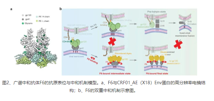 F6是第一株分離自CRF01_AE感染個體的廣譜中和抗體。研究團(tuán)隊還通過高分辨率冷凍電鏡結(jié)構(gòu)解析揭示了F6在Env蛋白上的詳細(xì)抗原表位(圖2a),并進(jìn)一步通過結(jié)構(gòu)分析與功能實(shí)驗(yàn)驗(yàn)證闡明了F6的新型中和機(jī)制(圖2b):F6一方面通過變構(gòu)效應(yīng)擾動Env蛋白三聚體Apex區(qū)域的穩(wěn)定性,破壞Env蛋白與宿主CD4受體的結(jié)合,另一方面通過誘導(dǎo)三聚體的解體來阻礙Env蛋白介導(dǎo)的病毒包膜與細(xì)胞膜的融合,進(jìn)而抑制病毒對于宿主的入侵(圖2b)。
