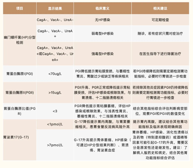 胃蛋白酶原I(PGI)、胃蛋白酶原II(PGII)、胃蛋白酶原比值(PGR)、胃泌素17(G-17)、細(xì)胞毒素(CagA)、空泡毒素(VacA)、尿素酶(Ure)